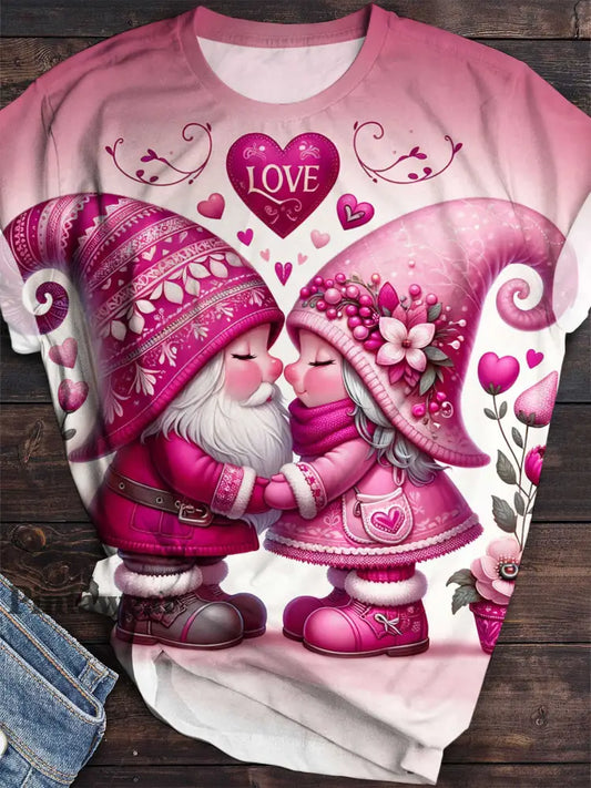 Valentine Love Gnomes Print Crew Neck T-Shirt