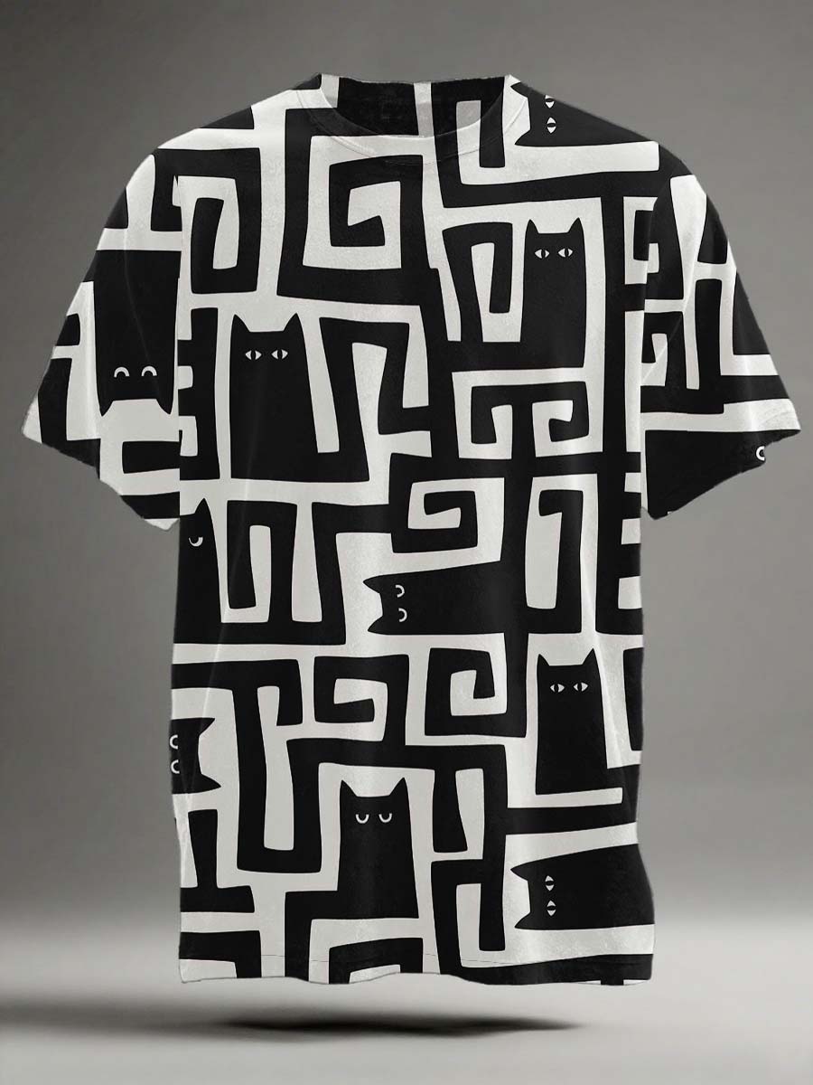Black Cat Maze Print Casual Camiseta de manga corta