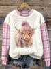 Sudadera de franela casual con estampado de cuadros de vaca Highland lindo para mujer